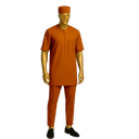 Step into sophisticated comfort with this warm camel-toned Senator set that exudes effortless style and versatility. This contemporary two-piece outfit combines the clean lines of modern menswear with traditional Nigerian tailoring, perfect for the fashion-forward gentleman seeking both comfort and distinction. The ensemble features a short-sleeved Senator top in a rich golden-tan shade, designed with a round neckline, practical chest pocket, and a sleek center-front placket. The minimalist design allows the beautiful fabric color to take center stage while maintaining professional elegance. Paired with perfectly matched straight-leg trousers, this outfit creates a cohesive, polished look.