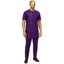 Contemporary navy blue short-sleeved senator set with minimalist white linear embroidery. The clean-cut top features three parallel white lines embroidered vertically on the chest creating modern geometric accent. Round neckline and relaxed fit offer comfortable contemporary styling. Paired with coordinating navy trousers for streamlined look. Made from quality solid navy fabric with crisp white threadwork. The simple linear design adds artistic touch without overwhelming the silhouette. Fresh navy and white combination creates nautical-inspired sophistication. Perfect for casual celebrations, weekend events, daytime gatherings, contemporary styling, or adding modern flair to traditional roots.