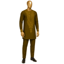 Warm terracotta long-sleeved senator set featuring elegant golden tonal embroidery cascading down the chest. Intricate flourishing vine and floral patterns create beautiful organic embellishment in matching golden-amber tones. Round neckline with refined styling and embroidered cuff detailing add sophisticated touches. Paired with coordinating terracotta trousers for complete harmony. Crafted from premium solid fabric with expert tonal embroidery work throughout. The earthy terracotta hue paired with metallic golden threadwork creates warm, inviting elegance. Flowing embroidery patterns add movement and artistry. Perfect for cultural celebrations, formal ceremonies, special occasions, traditional events, or warm-toned sophisticated styling.