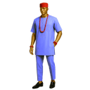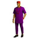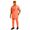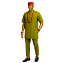 Celebrate Igbo heritage with this sophisticated sage green Senator ensemble featuring traditional embroidered detailing that pays homage to the iconic Isiagu style. This versatile two-piece set combines cultural authenticity with contemporary wearability, perfect for the modern Nigerian gentleman who honors his roots. The outfit features a short-sleeved Senator top in muted sage green fabric, adorned with tonal embroidery on the chest pocket area that echoes traditional lion head motifs in subtle, refined detail. The round neckline and relaxed fit ensure comfortable elegance. Paired with matching straight-leg trousers, this ensemble creates a cohesive, distinguished look. The styling is elevated with a vibrant red traditional cap (Fez/Fila) and coral beads, adding bold cultural accents.