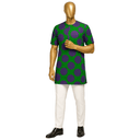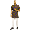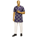 Vibrant teal and purple ankara print short-sleeved senator with bold circular motifs. Large medallion patterns in deep purple create striking contrast against the rich teal background. Relaxed contemporary fit offers comfortable modern styling. Paired with crisp white trousers for fresh color-blocked appeal. Made from authentic African wax print fabric with saturated jewel tones. The oversized circular pattern creates dramatic visual impact and festival energy. Contemporary senator silhouette gives traditional print modern versatile wearability. Perfect for cultural events, festive celebrations, artistic gatherings, fashion-forward occasions, or showcasing vibrant African textile heritage with contemporary flair.