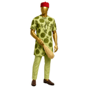 This cream-colored short-sleeved tunic features an all-over print of brown and rust botanical medallions and palm fronds. The earthy pattern creates visual richness across the entire garment. Paired with cream trousers and a vibrant red cap, this ensemble balances pattern with solid color. The natural fiber brush accessory adds an authentic finishing touch. The breathable fabric and relaxed fit make this ideal for warm-weather celebrations. The botanical print offers interest without being overwhelming, while the red cap adds a pop of color. Style with brown leather footwear to complement the earthy tones.