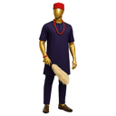 This deep navy short-sleeved tunic features clean lines and simple silhouette paired with bold red cap and matching red coral bead necklace and bracelet. The navy fabric offers versatile base while the red accessories create striking color contrast. Complete with matching navy trousers and natural fiber brush accessory for authentic presentation. The minimalist design focuses on quality fabric and impeccable tailoring rather than heavy embellishment. The red and navy combination creates classic yet bold color pairing. Easy to dress up or down depending on accessories chosen.