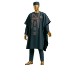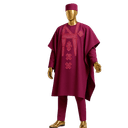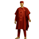 Command attention with this spectacular bronze-brown Agbada featuring stunning copper embroidery that celebrates African heritage with unmatched sophistication. This luxurious three-piece ensemble is crafted for the distinguished gentleman who appreciates rich earth tones and intricate artisanship. The outfit showcases a flowing Agbada in deep chocolate-brown fabric, beautifully adorned with elaborate copper-toned embroidery in traditional geometric patterns. The chest features an impressive vertical panel with cross and diamond motifs, complemented by matching shoulder embellishments that create a balanced, regal aesthetic. The dramatic wide sleeves add gravitas and presence. Complete with matching trousers and a coordinating brown Kufi cap, this ensemble delivers powerful, sophisticated style.