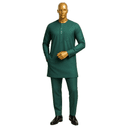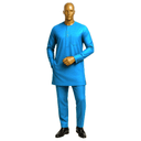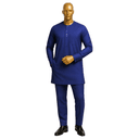 Sleek navy blue long-sleeved senator ensemble with subtle white accent embroidery. The fitted top features clean lines with delicate white cross-stitch detailing at the neckline adding refined touch. Classic mandarin collar and chest pocket maintain traditional sophistication. Paired with coordinating navy trousers for streamlined monochromatic styling. Made from premium solid navy fabric with smooth luxurious finish. Minimal embellishment keeps design contemporary and versatile. The deep navy tone offers professional elegance suitable across occasions. Understated detailing allows quality fabric and impeccable tailoring to shine. Ideal for business events, formal gatherings, religious services, everyday distinguished wear, or professional styling.