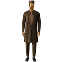 Sophisticated charcoal long kaftan featuring subtle tonal embroidered chest panel. The flowing design showcases delicate embroidery in matching gray tones creating understated texture and dimension. Round neckline with refined styling and long sleeves offer elegant coverage. Paired with coordinating charcoal trousers and matching traditional cap for complete ensemble. Made from premium solid fabric with expert tone-on-tone embroidery work. The monochromatic palette exudes quiet luxury and refined taste. Understated embellishment maintains contemporary appeal while honoring traditional craftsmanship. Ideal for formal ceremonies, business-formal events, religious services, sophisticated gatherings, or refined everyday elegance.