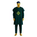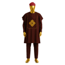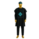 Experience refined elegance with this sophisticated all-black Agbada ensemble featuring a striking gold embroidered medallion centerpiece. This three-piece set combines minimalist sophistication with luxurious detailing, perfect for the discerning gentleman who appreciates understated opulence and timeless style. The outfit showcases a short-sleeved Agbada in premium black fabric with a magnificent gold embroidered medallion design on the chest, framed by elegant golden piping that creates a rectangular panel. The intricate circular motif features traditional geometric patterns that catch light beautifully. The wide-sleeve design maintains traditional flow while the contemporary cut offers modern comfort. Complete with matching black trousers and a distinctive burgundy striped Kufi cap, this ensemble delivers sophisticated contrast and cultural elegance.