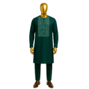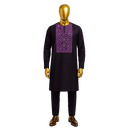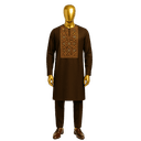 Discover timeless grace in this classic black kaftan adorned with bronze geometric embroidery across the chest. The long-sleeved design offers comfortable elegance while the metallic detailing adds dimension and cultural authenticity. This versatile piece transitions beautifully from religious observances to family celebrations, making it an essential addition to any traditional wardrobe. Pair with matching trousers for a complete refined look.