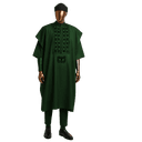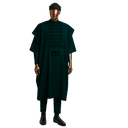 Command powerful presence with this sophisticated all-black Agbada ensemble featuring exquisite tonal embroidery and dramatic flowing silhouette. This elegant three-piece set embodies refined minimalism with intricate detailing, perfect for the distinguished gentleman who appreciates understated luxury and timeless style. This striking outfit showcases a short-sleeved Agbada in premium black fabric, elevated by stunning tonal black embroidery running vertically down the chest panel. The intricate threadwork features geometric patterns and traditional motifs that create subtle texture and visual depth against the rich black base. The traditional wide-sleeve design creates impressive flow and movement. Complete with matching black trousers and a coordinating black Kufi cap, this three-piece ensemble delivers monochromatic sophistication for black-tie weddings, formal ceremonies, upscale evening events, memorial services, and occasions requiring dignified elegance. The all-black aesthetic with tonal embroidery represents the height of sophisticated restraint while the detailed craftsmanship speaks to quality and cultural authenticity. Custom-tailored to your exact measurements for impeccable fit.
