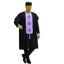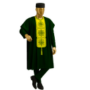 Make a bold statement with this dramatic layered ensemble featuring black outer Agbada with striking gold embroidered panel overlay. This luxurious four-piece set combines monochromatic sophistication with metallic accents, perfect for the gentleman who embraces high-contrast drama and contemporary layering. This spectacular outfit showcases a black long-sleeved inner Kaftan as the base, topped with a dramatic short-sleeved black Agbada. The centerpiece features a bold gold panel running vertically down the chest with black floral embroidered motifs arranged in three squares, finished with a decorative gold tassel. The layered design creates depth and visual interest. Complete with matching black trousers and a coordinating black Kufi cap, this complete ensemble delivers powerful style for high-fashion events, contemporary weddings, evening ceremonies, and occasions where you want maximum impact. Custom-tailored to your exact measurements.